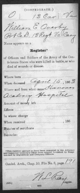 28 (date buried 4-28-1863) Overby, Wm E Pri. Co D 13th Sussex Va Cav.) Robert & Mary Overby (parents)