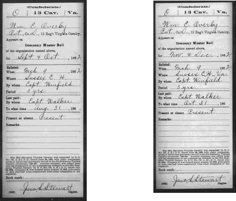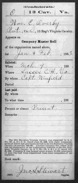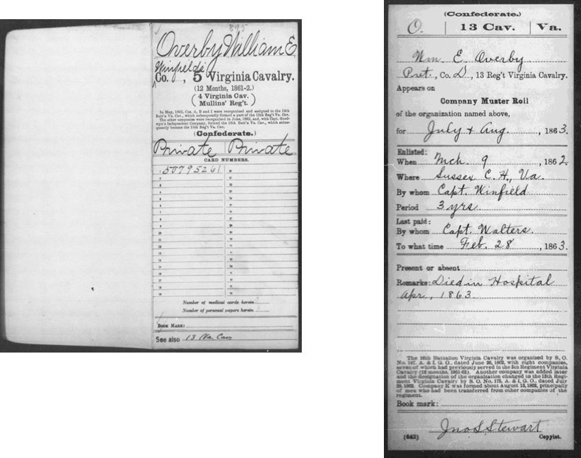 PVT, Co. "D" 13th Regt, VA Cavalry (formally the 5th VA CAV) He appears on the roster of Winfields Co., 5th VA Cav.
