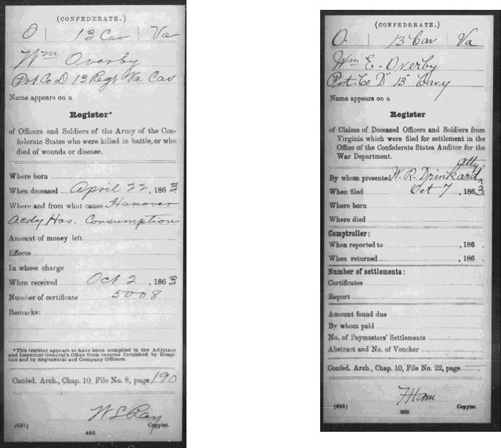 28 (date buried 4-28-1863) Overby, Wm E Pri. Co D 13th Sussex Va Cav.) Robert & Mary Overby (parents)