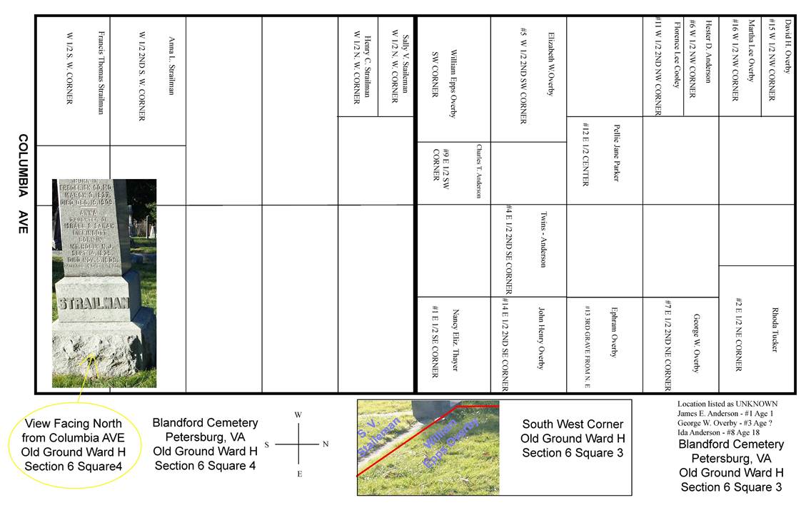 Research shows that she was buried in March of 1863 in the NW corner of the square adjoining the family square of William Epps Overby and the notation that he is in the SW corner of his square supports his being buried by S.V. Staileman as the original record indicates.